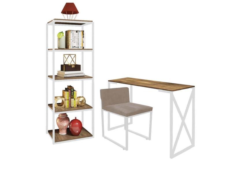 Kit Escritório Bex 1 Cadeira Corino Bege com 1 Mesa e 1 Livreiro Ferro Branco MDF Imbuia - Ahazzo Móveis