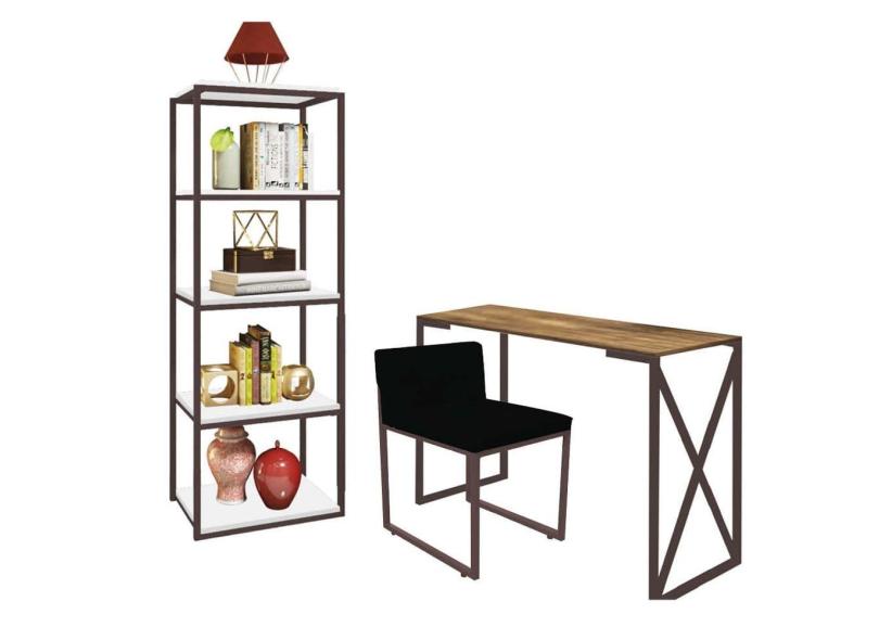 Kit Escritório Bex 1 Cadeira Corino Preto com 1 Mesa e 1 Livreiro Ferro Marrom MDF Imbuia - Ahazzo Móveis