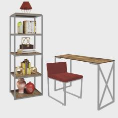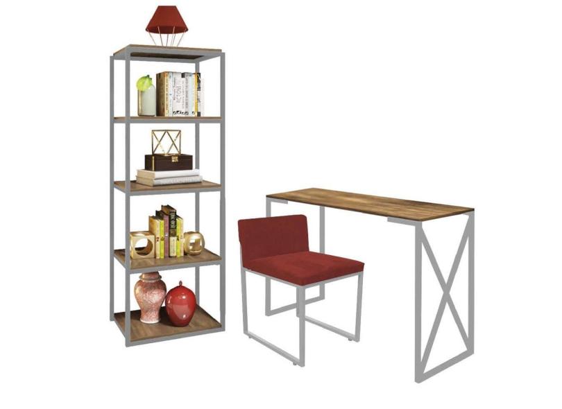 Kit Escritório Bex 1 Cadeira Corino Vermelho com 1 Mesa e 1 Livreiro Ferro Cinza MDF Carvalho - Ahazzo Móveis