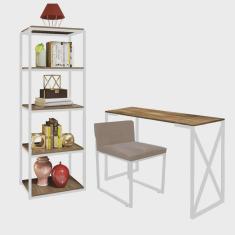 Kit Escritório Bex 1 Cadeira Sintético Bege com 1 Mesa e 1 Livreiro Ferro Branco MDF Caramelo - Ahazzo Móveis