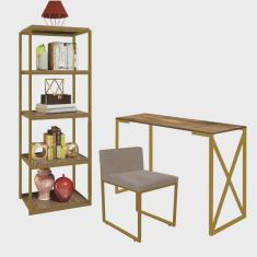 Kit Escritório Bex 1 Cadeira Sintético Bege com 1 Mesa e 1 Livreiro Ferro Dourado MDF Imbuia - Ahazzo Móveis