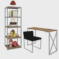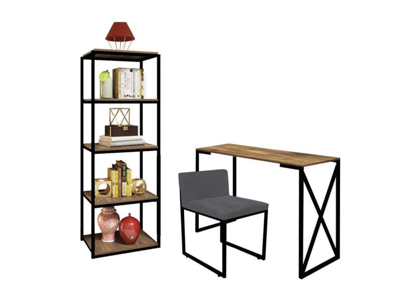 Kit Escritório Bex 1 Cadeira Sintético Cinza com 1 Mesa e 1 Livreiro Ferro Preto MDF Caramelo - Ahazzo Móveis