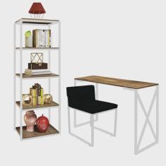 Kit Escritório Bex 1 Cadeira Sintético Preto com 1 Mesa e 1 Livreiro Ferro Branco MDF Carvalho - Ahazzo Móveis