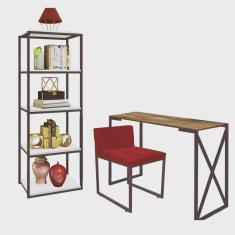 Kit Escritório Bex 1 Cadeira Sintético Vermelho com 1 Mesa e 1 Livreiro Ferro Marrom MDF Freijó - Ahazzo Móveis
