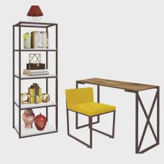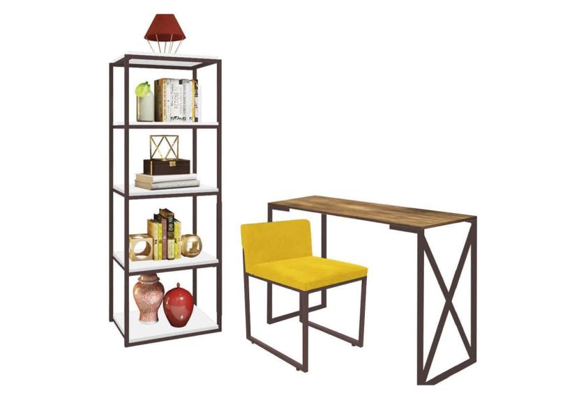 Kit Escritório Bex 1 Cadeira Suede Amarelo com 1 Mesa e 1 Livreiro Ferro Marrom MDF Caramelo - Ahazzo Móveis