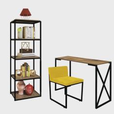 Kit Escritório Bex 1 Cadeira Suede Amarelo com 1 Mesa e 1 Livreiro Ferro Preto MDF Caramelo - Ahazzo Móveis