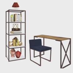 Kit Escritório Bex 1 Cadeira Suede Azul Marinho com 1 Mesa e 1 Livreiro Ferro Marrom MDF Carvalho - Ahazzo Móveis