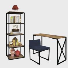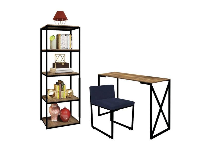 Kit Escritório Bex 1 Cadeira Suede Azul Marinho com 1 Mesa e 1 Livreiro Ferro Preto MDF Freijó - Ahazzo Móveis