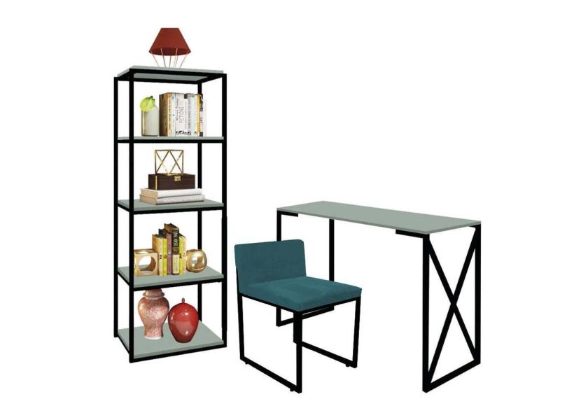 Kit Escritório Bex 1 Cadeira Suede Azul Turquesa com 1 Mesa e 1 Livreiro Ferro Preto MDF Verde Oliva - Ahazzo Móveis