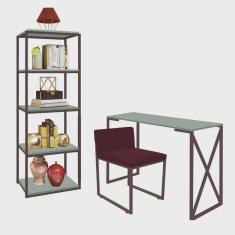 Kit Escritório Bex 1 Cadeira Suede Bordô com 1 Mesa e 1 Livreiro Ferro Marrom MDF Verde Oliva - Ahazzo Móveis