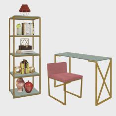 Kit Escritório Bex 1 Cadeira Suede Rose com 1 Mesa e 1 Livreiro Ferro Dourado MDF Verde Oliva - Ahazzo Móveis