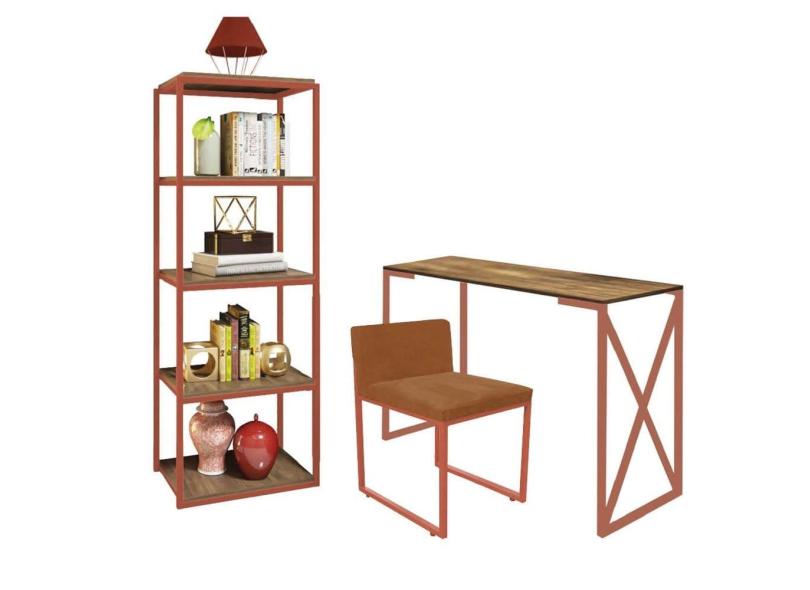 Kit Escritório Bex 1 Cadeira Suede Terracota com 1 Mesa e 1 Livreiro Ferro Bronze MDF Caramelo - Ahazzo Móveis