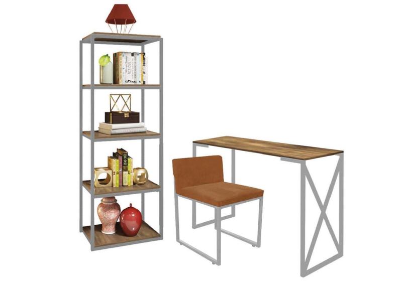 Kit Escritório Bex 1 Cadeira Suede Terracota com 1 Mesa e 1 Livreiro Ferro Cinza MDF Imbuia - Ahazzo Móveis
