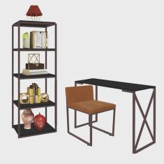 Kit Escritório Bex 1 Cadeira Suede Terracota com 1 Mesa e 1 Livreiro Ferro Marrom MDF Preto - Ahazzo Móveis