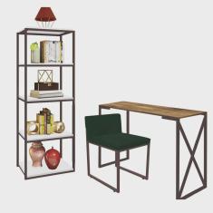 Kit Escritório Bex 1 Cadeira Suede Verde com 1 Mesa e 1 Livreiro Ferro Marrom MDF Caramelo - Ahazzo Móveis