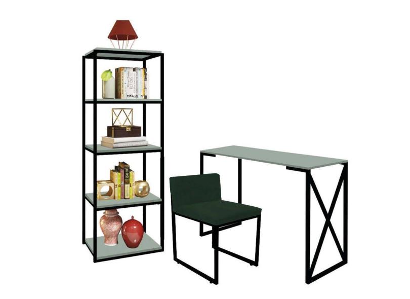 Kit Escritório Bex 1 Cadeira Suede Verde com 1 Mesa e 1 Livreiro Ferro Preto MDF Verde Oliva - Ahazzo Móveis