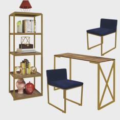 Kit Escritório Bex 2 Cadeiras Corino Azul Marinho com 1 Mesa e 1 Livreiro Ferro Dourado MDF Carvalho - Ahazzo Móveis