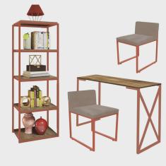 Kit Escritório Bex 2 Cadeiras Corino Bege com 1 Mesa e 1 Livreiro Ferro Bronze MDF Caramelo - Ahazzo Móveis