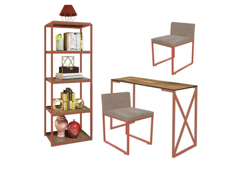 Kit Escritório Bex 2 Cadeiras Sintético Bege com 1 Mesa e 1 Livreiro Ferro Bronze MDF Imbuia - Ahazzo Móveis