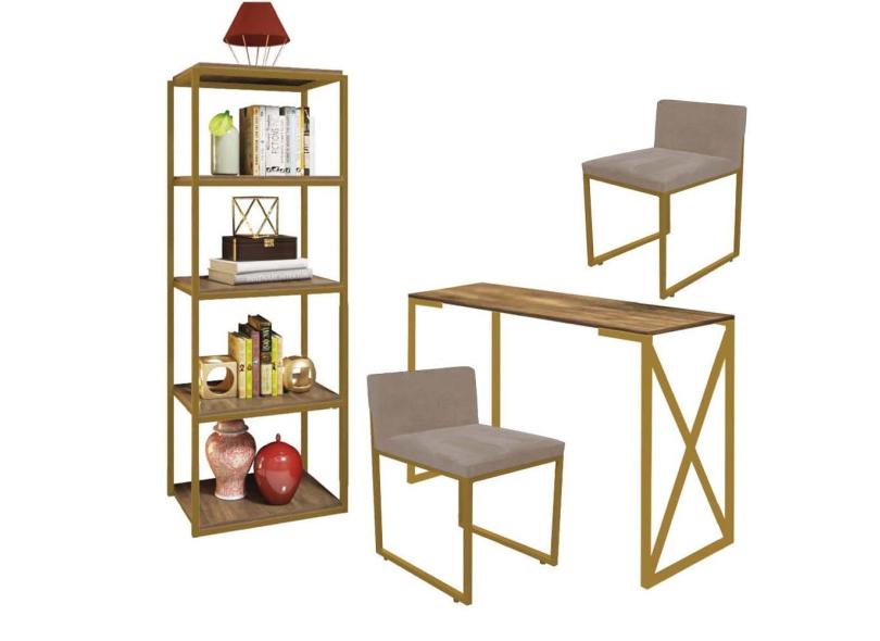 Kit Escritório Bex 2 Cadeiras Sintético Bege com 1 Mesa e 1 Livreiro Ferro Dourado MDF Imbuia - Ahazzo Móveis