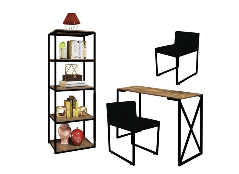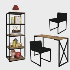Kit Escritório Bex 2 Cadeiras Sintético Preto com 1 Mesa e 1 Livreiro Ferro Preto MDF Freijó - Ahazzo Móveis