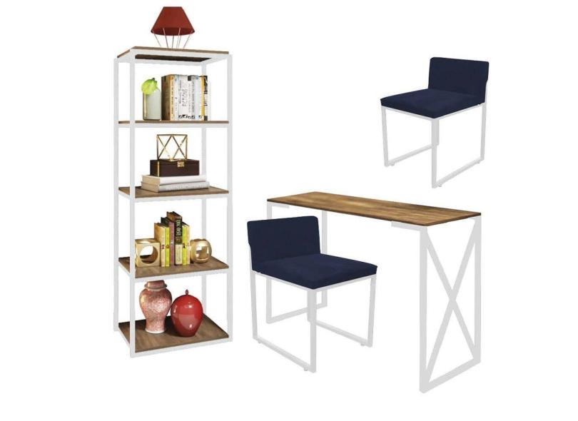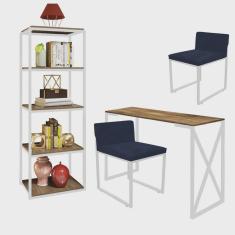 Kit Escritório Bex 2 Cadeiras Suede Azul Marinho com 1 Mesa e 1 Livreiro Ferro Branco MDF Caramelo - Ahazzo Móveis