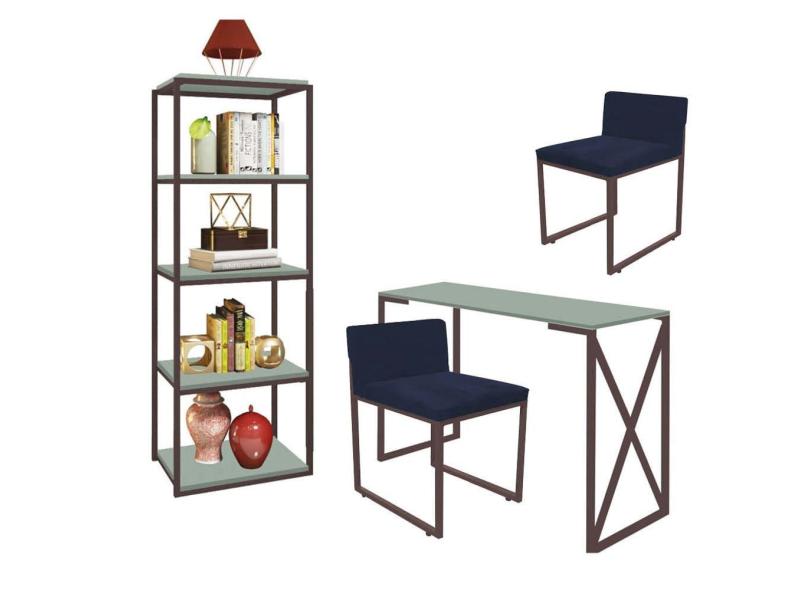 O menor preço encontrado no Brasil para Kit Escritório Bex 2 Cadeiras Suede Azul Marinho com 1 Mesa e 1 Livreiro Ferro Marrom MDF Verde Oliva - Ahazzo Móveis atualmente é R$ 1.609,90.
