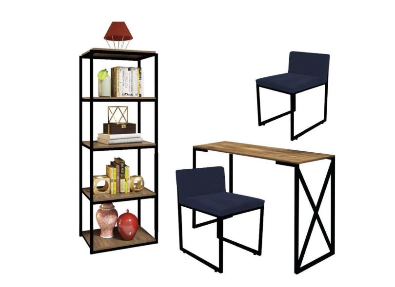 Kit Escritório Bex 2 Cadeiras Suede Azul Marinho com 1 Mesa e 1 Livreiro Ferro Preto MDF Carvalho - Ahazzo Móveis