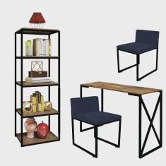 Kit Escritório Bex 2 Cadeiras Suede Azul Marinho com 1 Mesa e 1 Livreiro Ferro Preto MDF Imbuia - Ahazzo Móveis