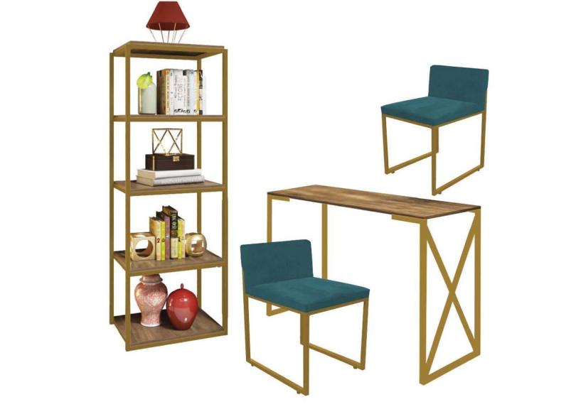 Kit Escritório Bex 2 Cadeiras Suede Azul Turquesa com 1 Mesa e 1 Livreiro Ferro Dourado MDF Castanho - Ahazzo Móveis
