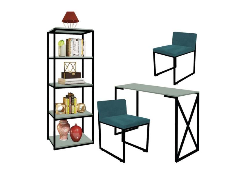 Kit Escritório Bex 2 Cadeiras Suede Azul Turquesa com 1 Mesa e 1 Livreiro Ferro Preto MDF Verde Oliva - Ahazzo Móveis