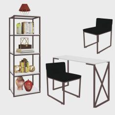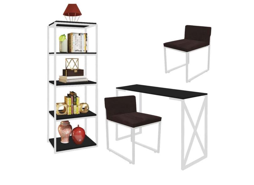 Kit Escritório Bex 2 Cadeiras Suede Marrom com 1 Mesa e 1 Livreiro Ferro Branco MDF Preto - Ahazzo Móveis
