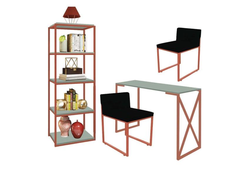 Kit Escritório Bex 2 Cadeiras Suede Preto com 1 Mesa e 1 Livreiro Ferro Bronze MDF Verde Oliva - Ahazzo Móveis