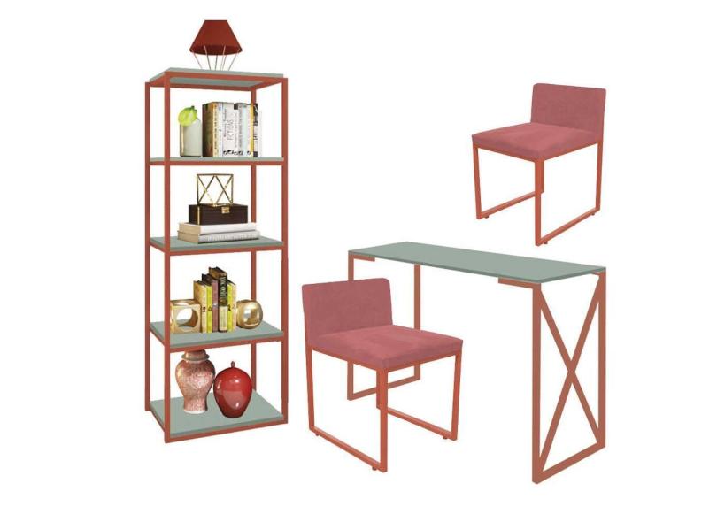 Kit Escritório Bex 2 Cadeiras Suede Rose com 1 Mesa e 1 Livreiro Ferro Bronze MDF Verde Oliva - Ahazzo Móveis