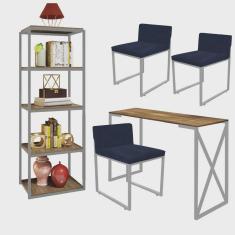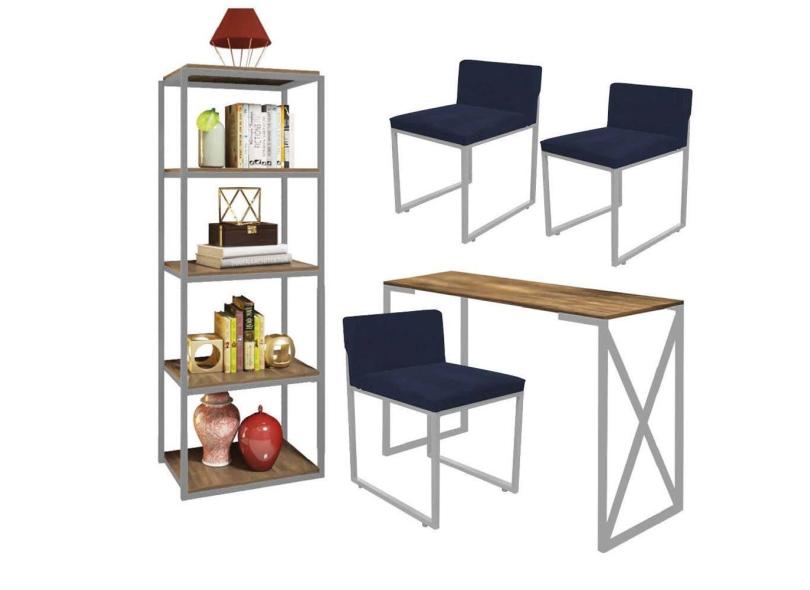 Kit Escritório Bex 3 Cadeiras Corino Azul Marinho com 1 Mesa e 1 Livreiro Ferro Cinza MDF Freijó - Ahazzo Móveis