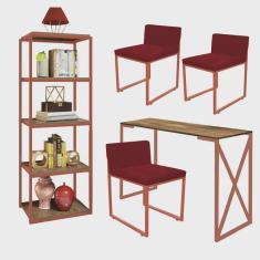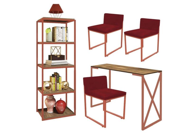 Kit Escritório Bex 3 Cadeiras Corino Vermelho com 1 Mesa e 1 Livreiro Ferro Bronze MDF Imbuia - Ahazzo Móveis