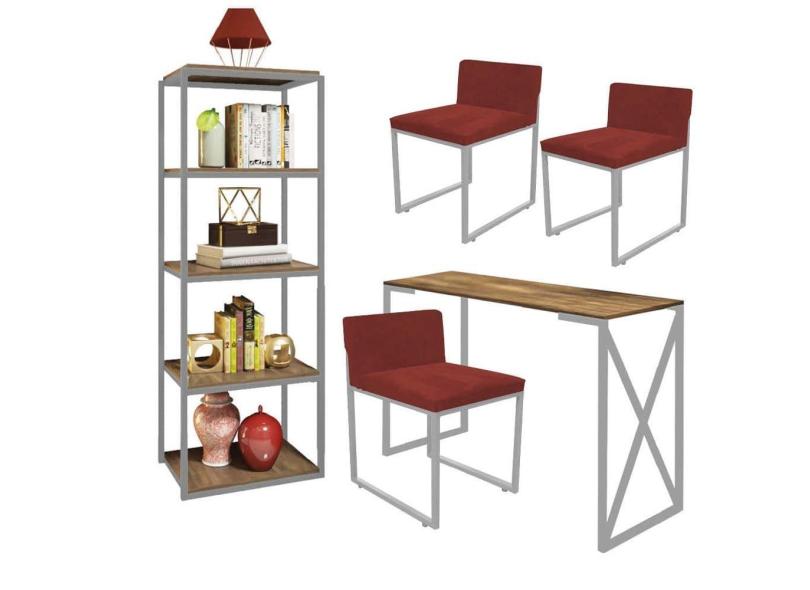 Kit Escritório Bex 3 Cadeiras Corino Vermelho com 1 Mesa e 1 Livreiro Ferro Cinza MDF Freijó - Ahazzo Móveis