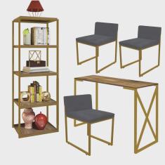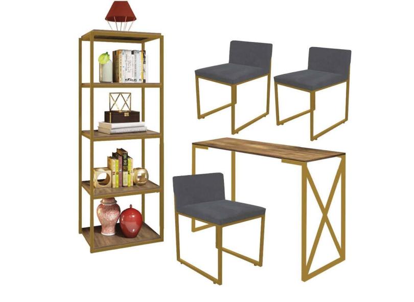 Kit Escritório Bex 3 Cadeiras Sintético Cinza com 1 Mesa e 1 Livreiro Ferro Dourado MDF Imbuia - Ahazzo Móveis