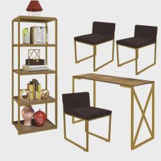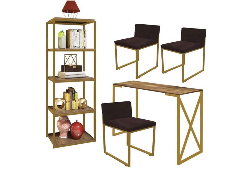 Kit Escritório Bex 3 Cadeiras Sintético Marrom com 1 Mesa e 1 Livreiro Ferro Dourado MDF Carvalho - Ahazzo Móveis