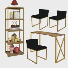 Kit Escritório Bex 3 Cadeiras Sintético Preto com 1 Mesa e 1 Livreiro Ferro Dourado MDF Imbuia - Ahazzo Móveis