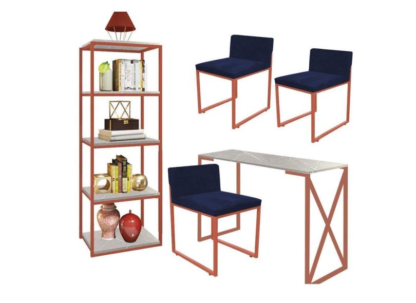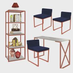 Kit Escritório Bex 3 Cadeiras Suede Azul Marinho com 1 Mesa e 1 Livreiro Ferro Bronze MDF Marmorizado Cinza - Ahazzo Móveis