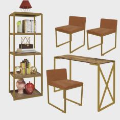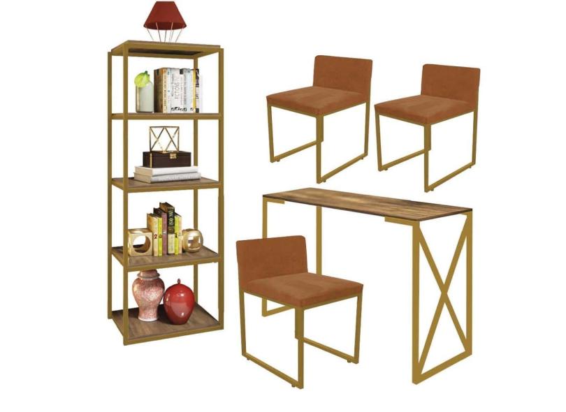 Kit Escritório Bex 3 Cadeiras Suede Terracota com 1 Mesa e 1 Livreiro Ferro Dourado MDF Freijó - Ahazzo Móveis