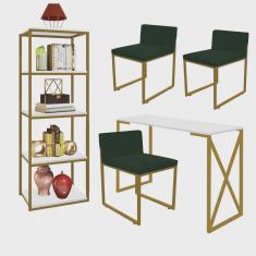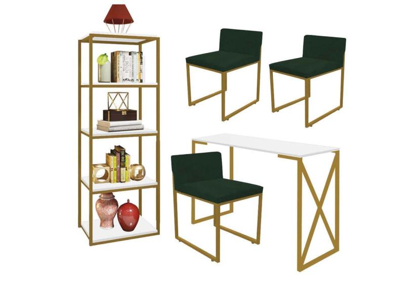 O menor preço encontrado no Brasil para Kit Escritório Bex 3 Cadeiras Suede Verde com 1 Mesa e 1 Livreiro Ferro Dourado MDF Branco - Ahazzo Móveis atualmente é R$ 1.909,90.