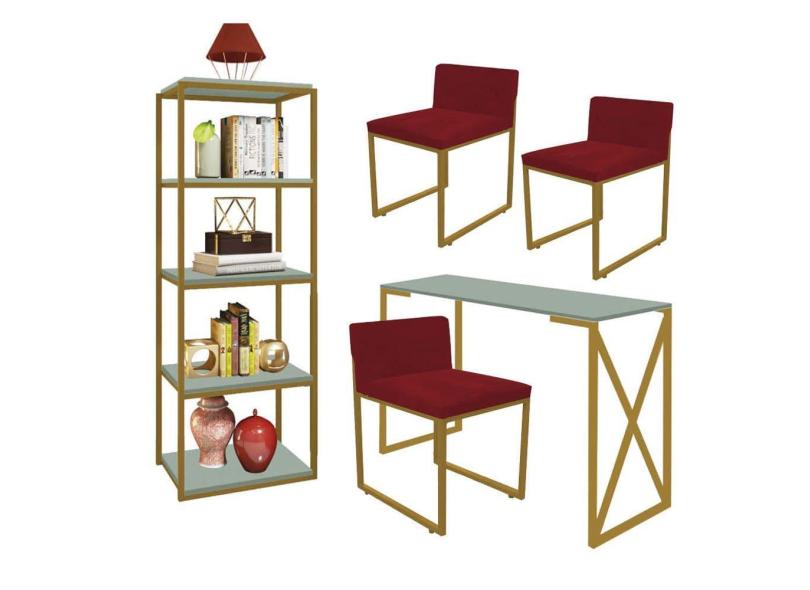 Kit Escritório Bex 3 Cadeiras Suede Vermelho com 1 Mesa e 1 Livreiro Ferro Dourado MDF Verde Oliva - Ahazzo Móveis