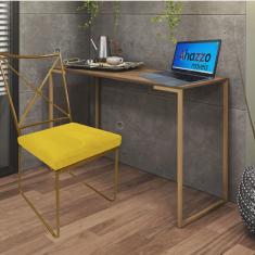 Kit Escritório Clark Cadeira e Mesa Industrial Ferro Dourado Tampo MDF Imbuia Corino Amarelo - Ahz Móveis