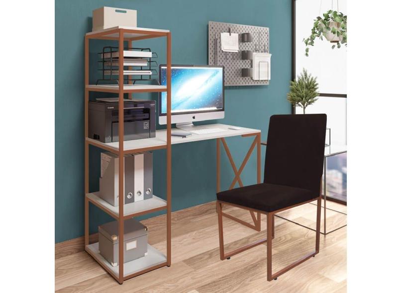 Kit Escritório Mesa Max BeX 5 Prateleiras e Cadeira Stan Bronze Tampo Branco Suede Marrom - Ahz Móveis