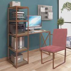 Kit Escritório Mesa Max BeX 5 Prateleiras e Cadeira Stan Bronze Tampo Imbuia Suede Rose Gold - Ahz Móveis