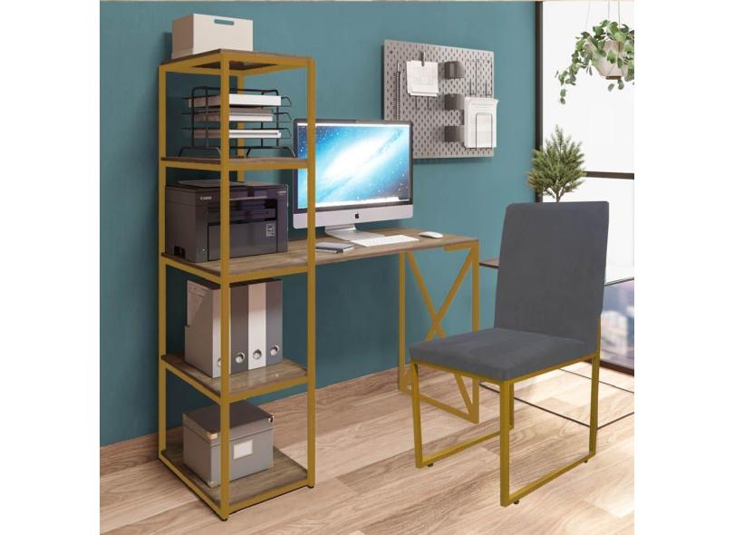Kit Escritório Mesa Max BeX 5 Prateleiras e Cadeira Stan Dourado Tampo Castanho Sintético Cinza - Ahz Móveis
