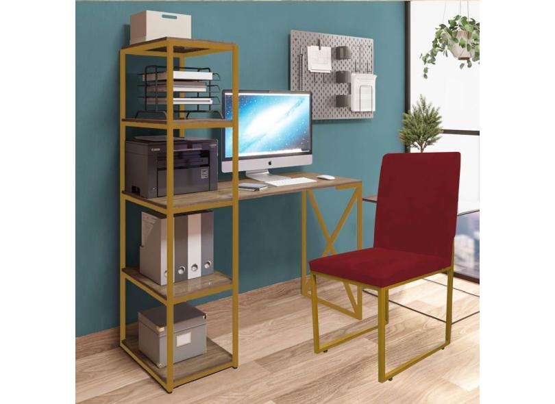 Kit Escritório Mesa Max BeX 5 Prateleiras e Cadeira Stan Dourado Tampo Imbuia Sintético Vermelho - Ahz Móveis