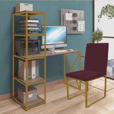 Kit Escritório Mesa Max BeX 5 Prateleiras e Cadeira Stan Dourado Tampo Madeira Suede Bordô - Ahz Móveis